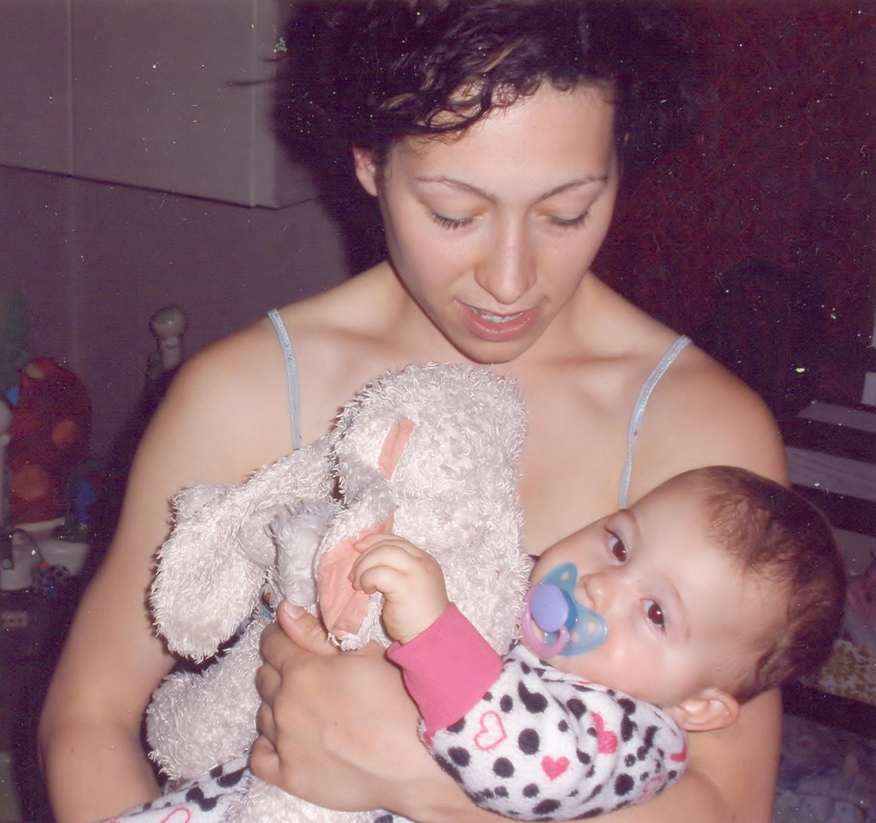 Irina the Comfortee becomes Mommy the Comforter to precious Charlotte in 2009. (Bun-Bun the bunny is, sadly, much rattier and stinkier now. He’s been through a lot.)