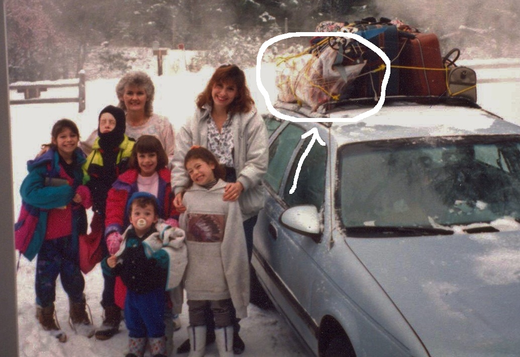 Leaving Grandma’s house after Thanksgiving, 1993. Eerily similar to the National Lampoon “Vacation” movie–there’s a deer carcass strapped to the top of our old Ford Taurus station wagon.